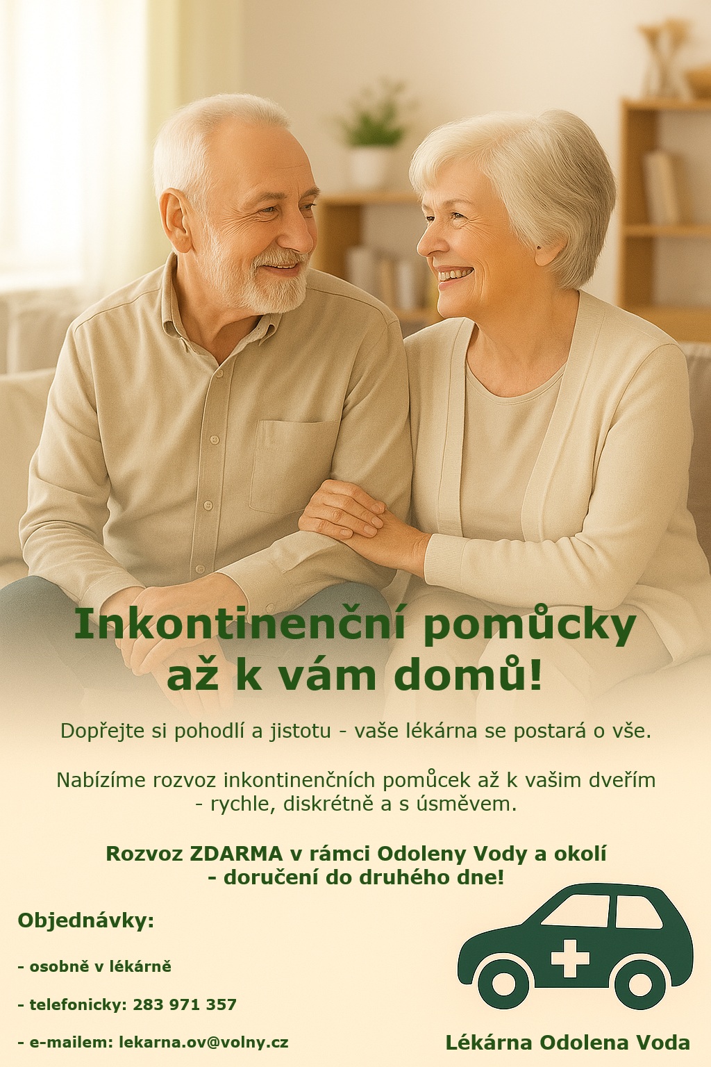 Lékárna Odolena Voda nabízí, rozvoz Inkontinenčních pomůcek, ale také léků. Vše se dozvíte v lékárně u zdravotního střediska Odolena Voda nebo na uvedeném tel. čísle v příloze.