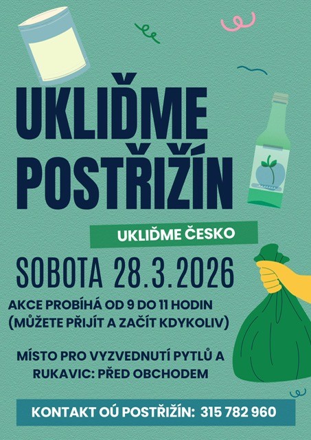 Rádi bychom Vás pozvali na každoroční akci „Ukliďme obec Postřižín“. Přijďte s námi pomoci zkrášlit naši obec. Budeme se těšit na Vaši účast.